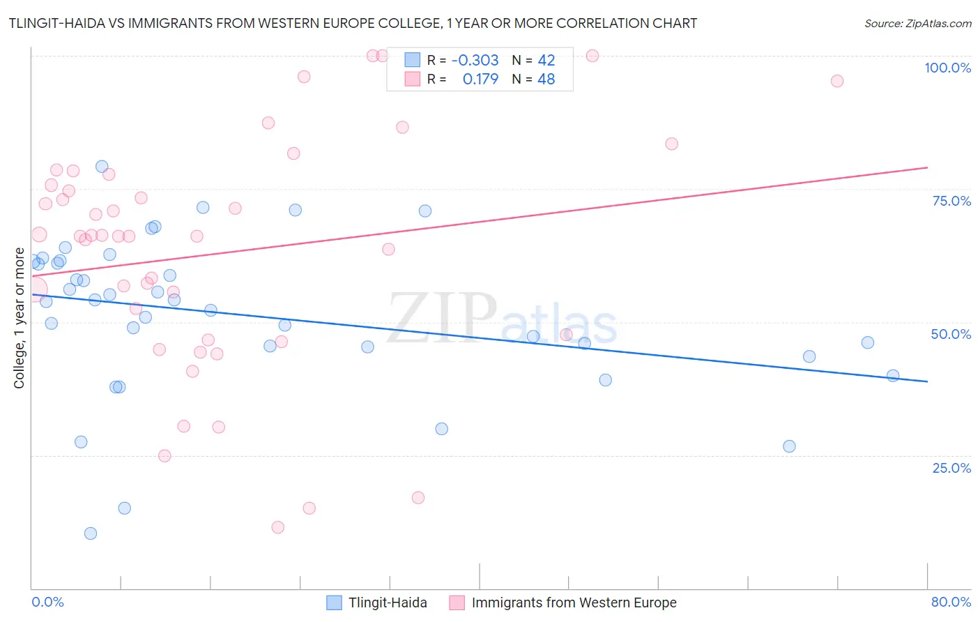 Tlingit-Haida vs Immigrants from Western Europe College, 1 year or more Correlation Chart