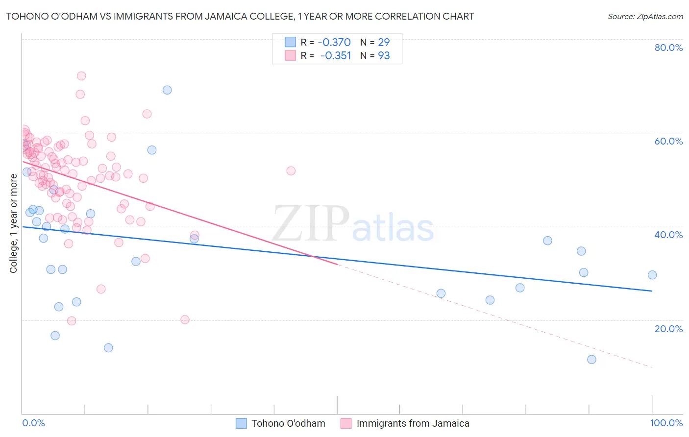 Tohono O'odham vs Immigrants from Jamaica College, 1 year or more Correlation Chart