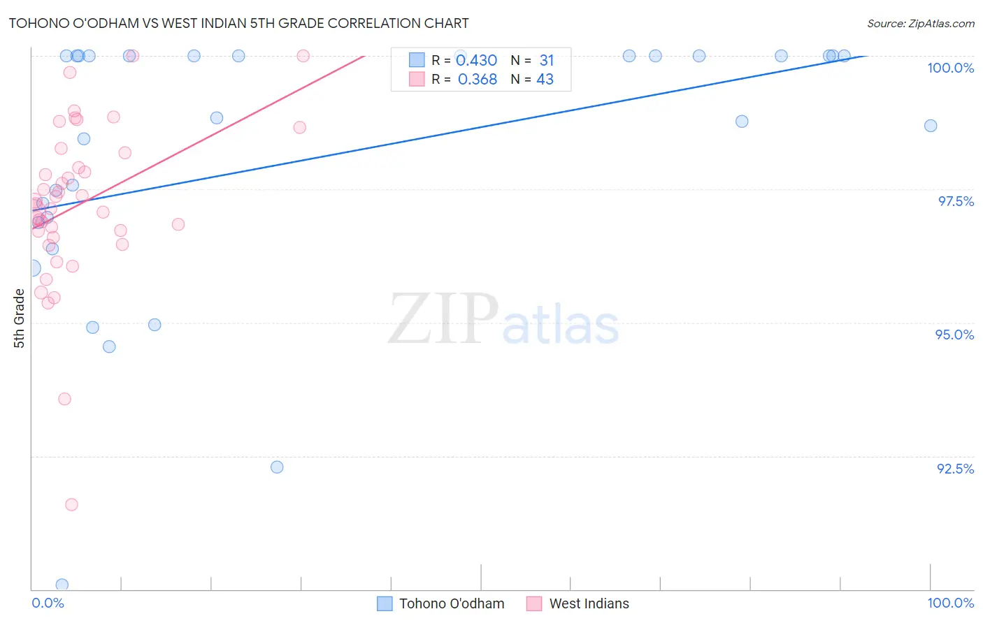 In terms of 5th grade, the demographic groups most similar to West Indians are Taiwanese (96.7%, a difference of 0.0%), Immigrants from Colombia (96.8%, a difference of 0.010%), Immigrants from Uzbekistan (96.8%, a difference of 0.010%), Immigrants from Nigeria (96.7%, a difference of 0.010%), and Immigrants from South America (96.7%, a difference of 0.010%).