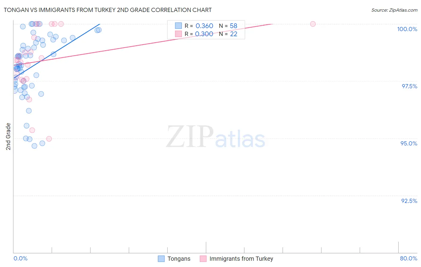 Tongan vs Immigrants from Turkey 2nd Grade Correlation Chart