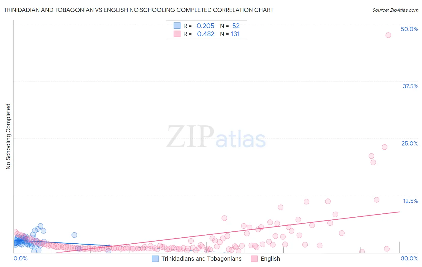 The statistical analysis conducted on geographies consisting of 219,048,767 people shows a weak negative correlation between the proportion of Trinidadians and Tobagonians and percentage of population with no schooling in the United States with a correlation coefficient (R) of -0.205 and weighted average of 2.6%. Similarly, the statistical analysis conducted on geographies consisting of 558,251,805 people shows a moderate positive correlation between the proportion of English and percentage of population with no schooling in the United States with a correlation coefficient (R) of 0.482 and weighted average of 1.4%, a difference of 87.5%.
