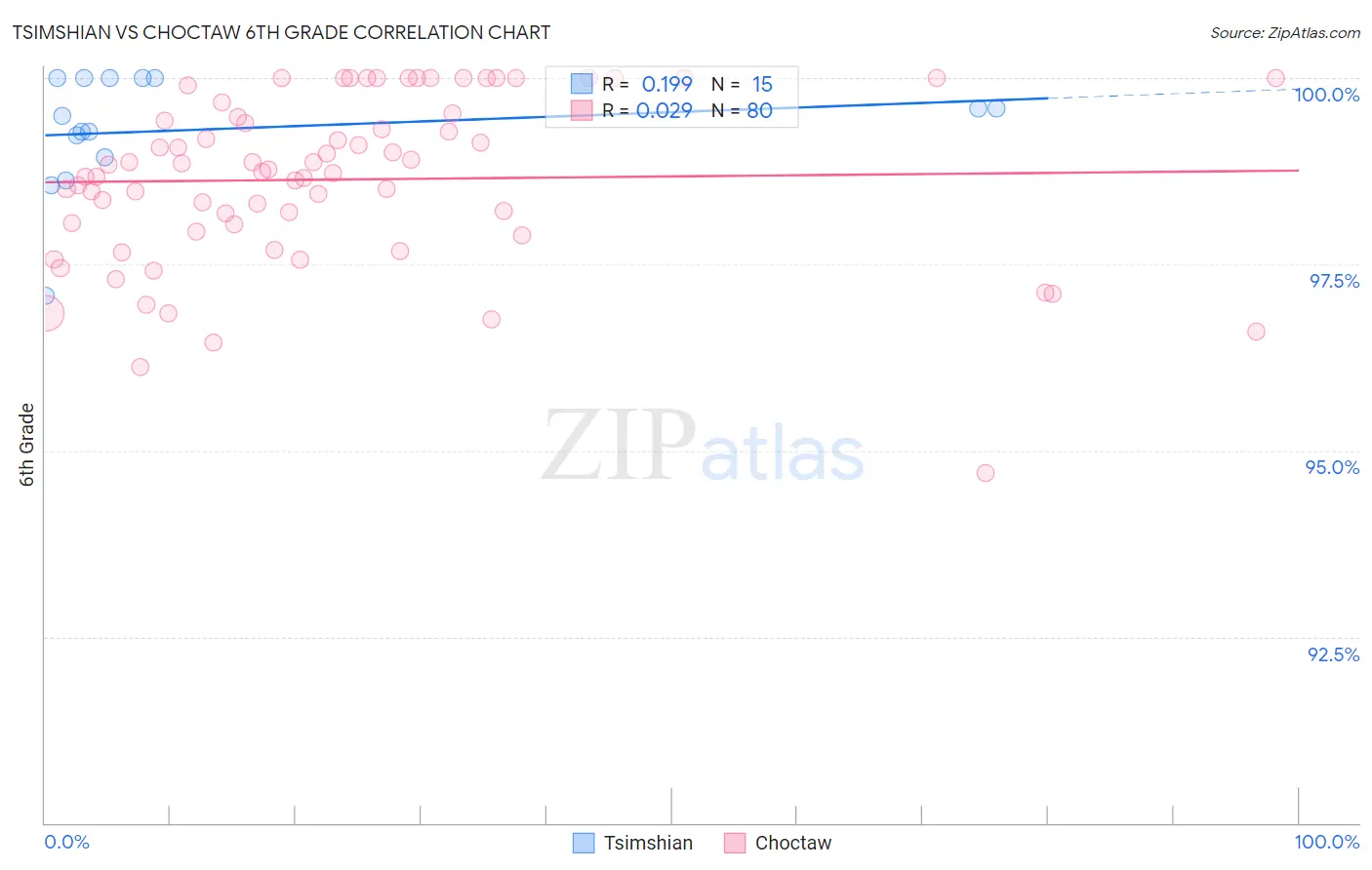 The statistical analysis conducted on geographies consisting of 15,626,544 people shows a poor positive correlation between the proportion of Tsimshian and percentage of population with at least 6th grade education in the United States with a correlation coefficient (R) of 0.199 and weighted average of 98.3%. Similarly, the statistical analysis conducted on geographies consisting of 269,741,679 people shows no correlation between the proportion of Choctaw and percentage of population with at least 6th grade education in the United States with a correlation coefficient (R) of 0.029 and weighted average of 97.5%, a difference of 0.83%.
