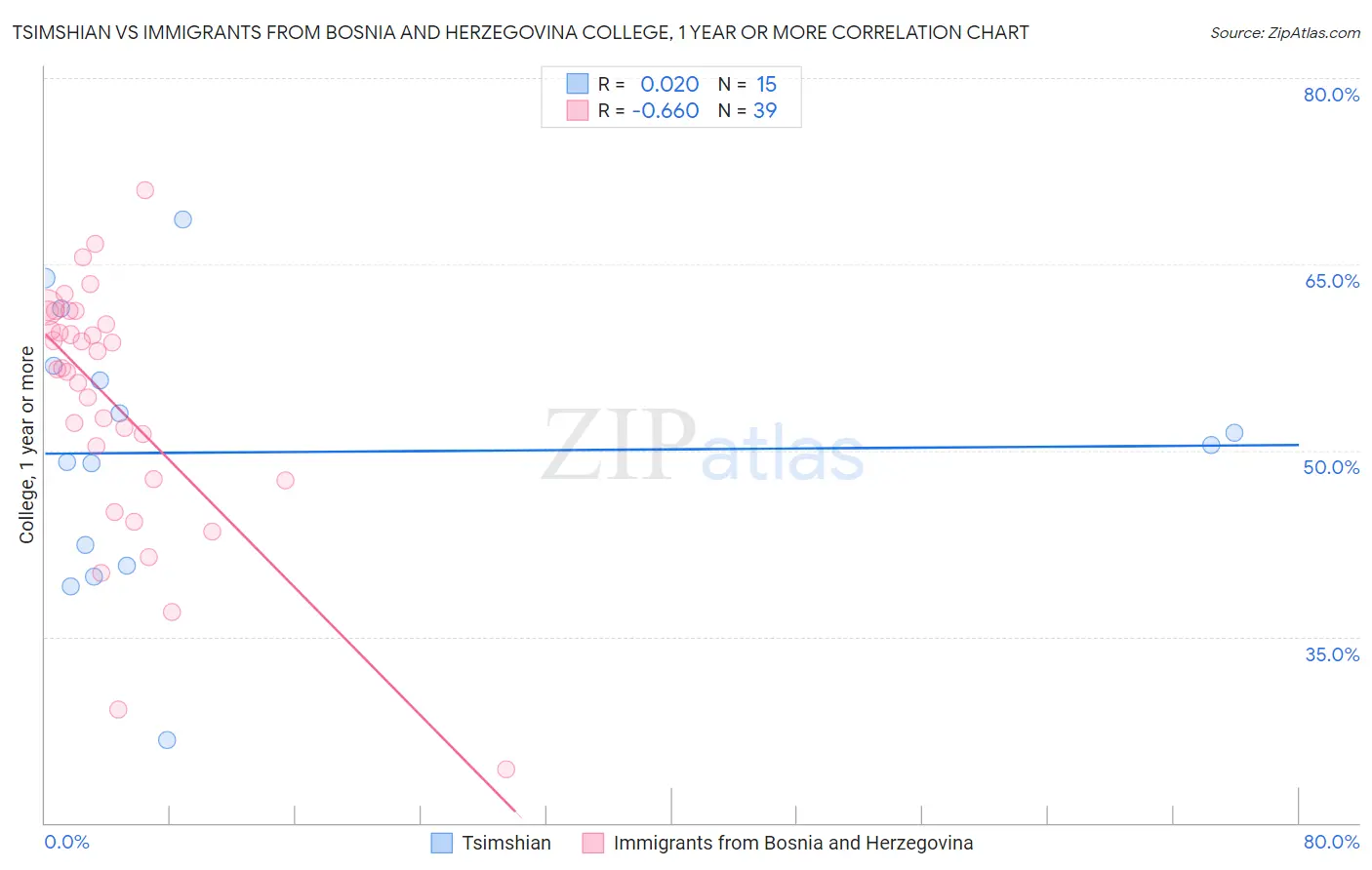 Tsimshian vs Immigrants from Bosnia and Herzegovina College, 1 year or more Correlation Chart