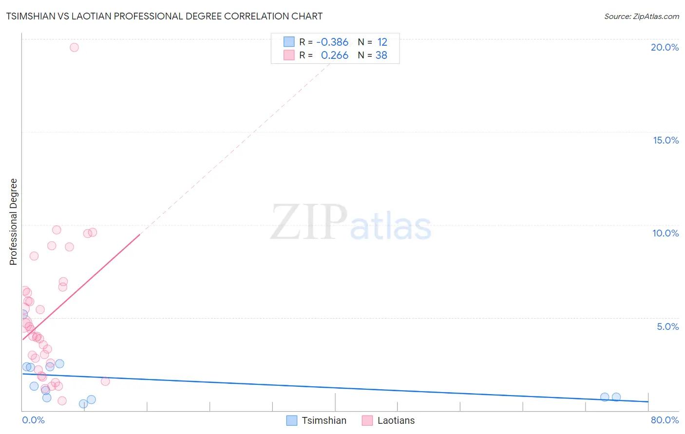 The statistical analysis conducted on geographies consisting of 15,614,727 people shows a mild negative correlation between the proportion of Tsimshian and percentage of population with at least professional degree education in the United States with a correlation coefficient (R) of -0.386 and weighted average of 3.2%. Similarly, the statistical analysis conducted on geographies consisting of 224,668,924 people shows a weak positive correlation between the proportion of Laotians and percentage of population with at least professional degree education in the United States with a correlation coefficient (R) of 0.266 and weighted average of 5.2%, a difference of 64.9%.