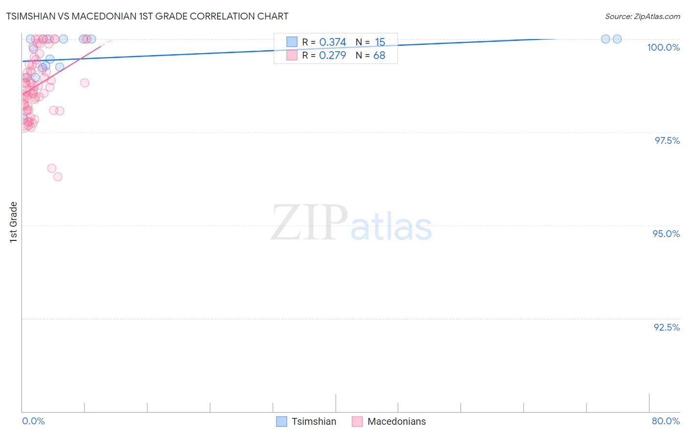 The statistical analysis conducted on geographies consisting of 15,626,544 people shows a mild positive correlation between the proportion of Tsimshian and percentage of population with at least 1st grade education in the United States with a correlation coefficient (R) of 0.374 and weighted average of 98.8%. Similarly, the statistical analysis conducted on geographies consisting of 132,592,860 people shows a weak positive correlation between the proportion of Macedonians and percentage of population with at least 1st grade education in the United States with a correlation coefficient (R) of 0.279 and weighted average of 98.3%, a difference of 0.59%.