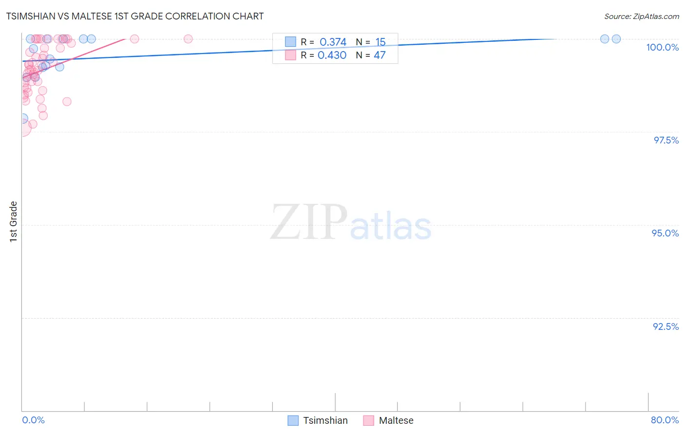 The statistical analysis conducted on geographies consisting of 15,626,544 people shows a mild positive correlation between the proportion of Tsimshian and percentage of population with at least 1st grade education in the United States with a correlation coefficient (R) of 0.374 and weighted average of 98.8%. Similarly, the statistical analysis conducted on geographies consisting of 126,476,608 people shows a moderate positive correlation between the proportion of Maltese and percentage of population with at least 1st grade education in the United States with a correlation coefficient (R) of 0.430 and weighted average of 98.4%, a difference of 0.48%.