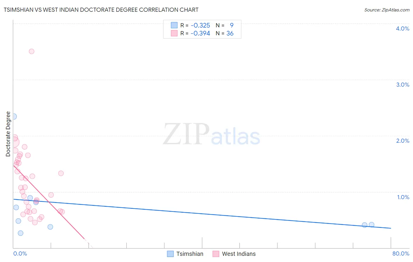 The statistical analysis conducted on geographies consisting of 15,584,822 people shows a mild negative correlation between the proportion of Tsimshian and percentage of population with at least doctorate degree education in the United States with a correlation coefficient (R) of -0.325 and weighted average of 1.4%. Similarly, the statistical analysis conducted on geographies consisting of 252,865,047 people shows a mild negative correlation between the proportion of West Indians and percentage of population with at least doctorate degree education in the United States with a correlation coefficient (R) of -0.394 and weighted average of 1.6%, a difference of 13.3%.
