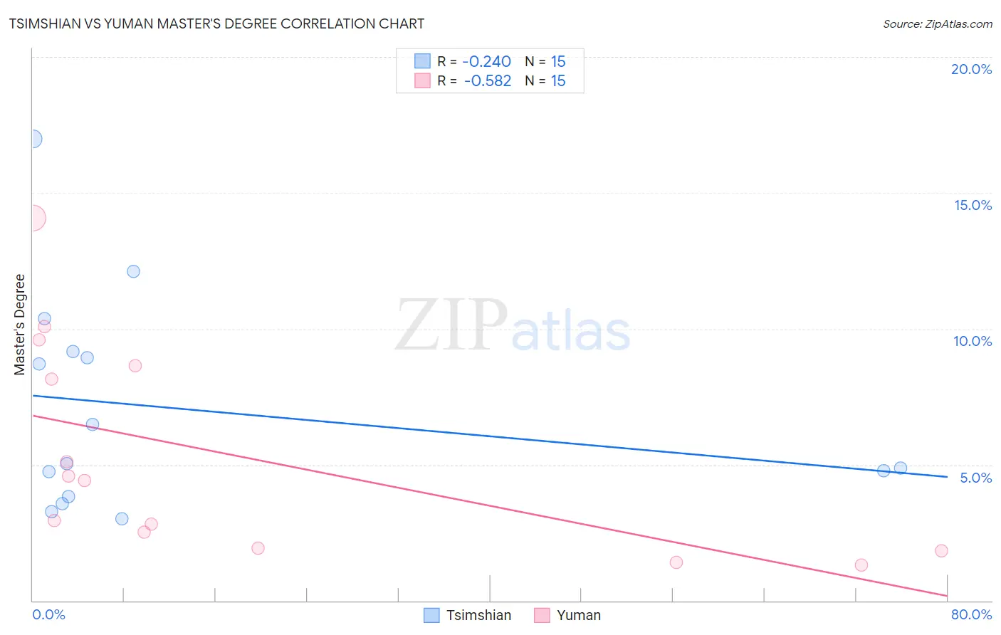 The statistical analysis conducted on geographies consisting of 15,626,544 people shows a weak negative correlation between the proportion of Tsimshian and percentage of population with at least master's degree education in the United States with a correlation coefficient (R) of -0.240 and weighted average of 11.4%. Similarly, the statistical analysis conducted on geographies consisting of 40,680,215 people shows a substantial negative correlation between the proportion of Yuman and percentage of population with at least master's degree education in the United States with a correlation coefficient (R) of -0.582 and weighted average of 9.2%, a difference of 23.5%.