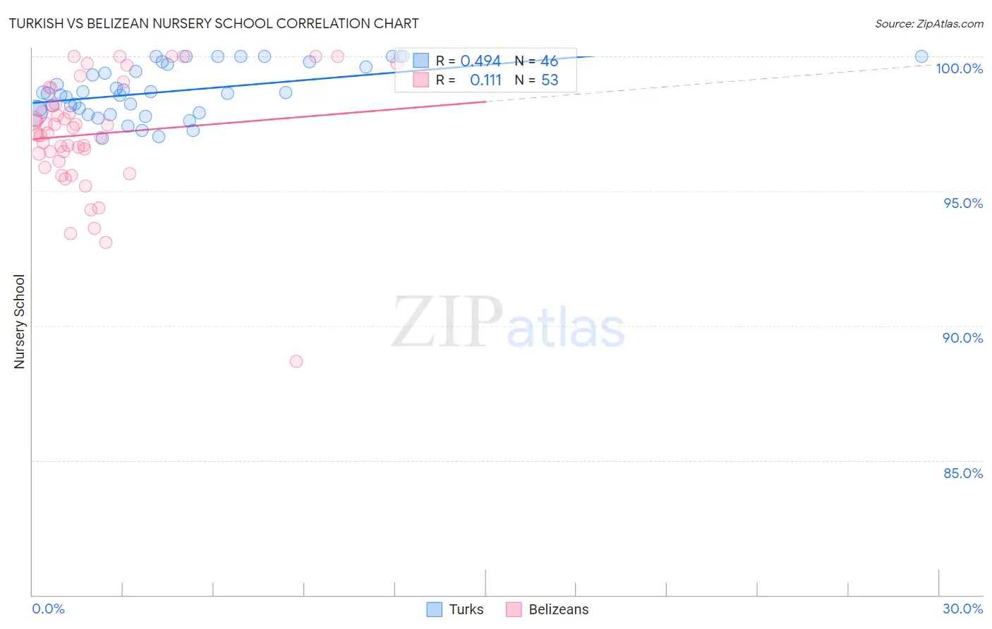 In terms of nursery school, the demographic groups most similar to Turks are Bhutanese (98.2%, a difference of 0.0%), Immigrants from Switzerland (98.2%, a difference of 0.0%), Basque (98.2%, a difference of 0.0%), Immigrants from Ireland (98.3%, a difference of 0.010%), and Cree (98.3%, a difference of 0.010%).