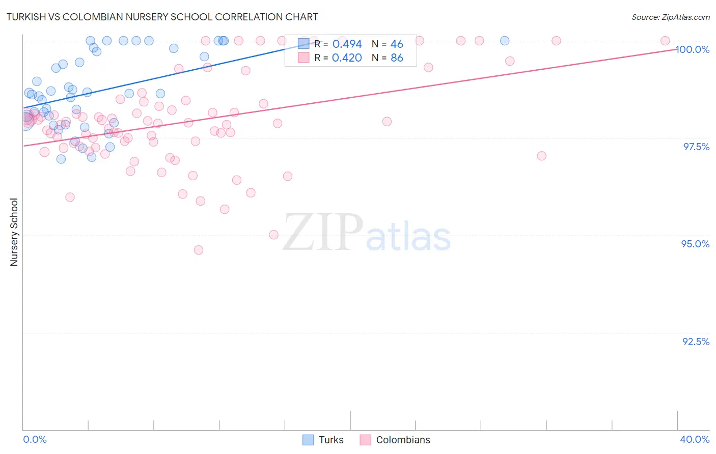 The statistical analysis conducted on geographies consisting of 271,858,657 people shows a moderate positive correlation between the proportion of Turks and percentage of population with at least nursery school education in the United States with a correlation coefficient (R) of 0.494 and weighted average of 98.2%. Similarly, the statistical analysis conducted on geographies consisting of 419,700,680 people shows a moderate positive correlation between the proportion of Colombians and percentage of population with at least nursery school education in the United States with a correlation coefficient (R) of 0.420 and weighted average of 97.7%, a difference of 0.56%.