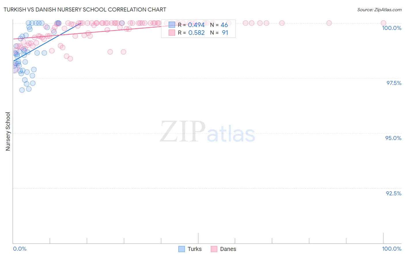 In terms of nursery school, the demographic groups most similar to Turks are Bhutanese (98.2%, a difference of 0.0%), Immigrants from Switzerland (98.2%, a difference of 0.0%), Basque (98.2%, a difference of 0.0%), Immigrants from Ireland (98.3%, a difference of 0.010%), and Cree (98.3%, a difference of 0.010%).