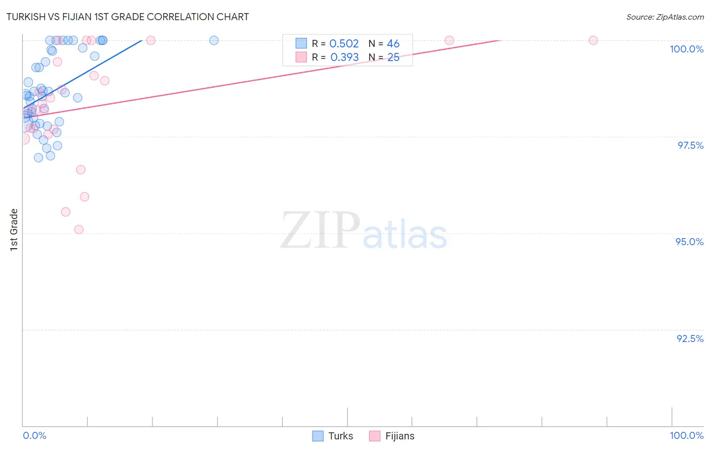 In terms of 1st grade, the demographic groups most similar to Turks are Pima (98.2%, a difference of 0.0%), Basque (98.2%, a difference of 0.0%), Immigrants from Switzerland (98.2%, a difference of 0.0%), Bhutanese (98.2%, a difference of 0.0%), and Romanian (98.2%, a difference of 0.010%).