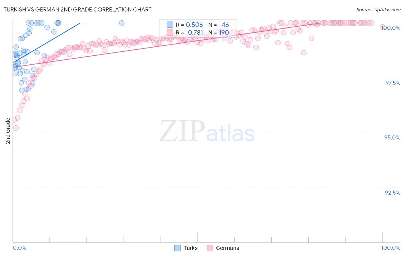 In terms of 2nd grade, the demographic groups most similar to Turks are Pima (98.2%, a difference of 0.0%), Yugoslavian (98.2%, a difference of 0.0%), Bhutanese (98.1%, a difference of 0.0%), German Russian (98.1%, a difference of 0.0%), and Immigrants from Switzerland (98.1%, a difference of 0.010%).