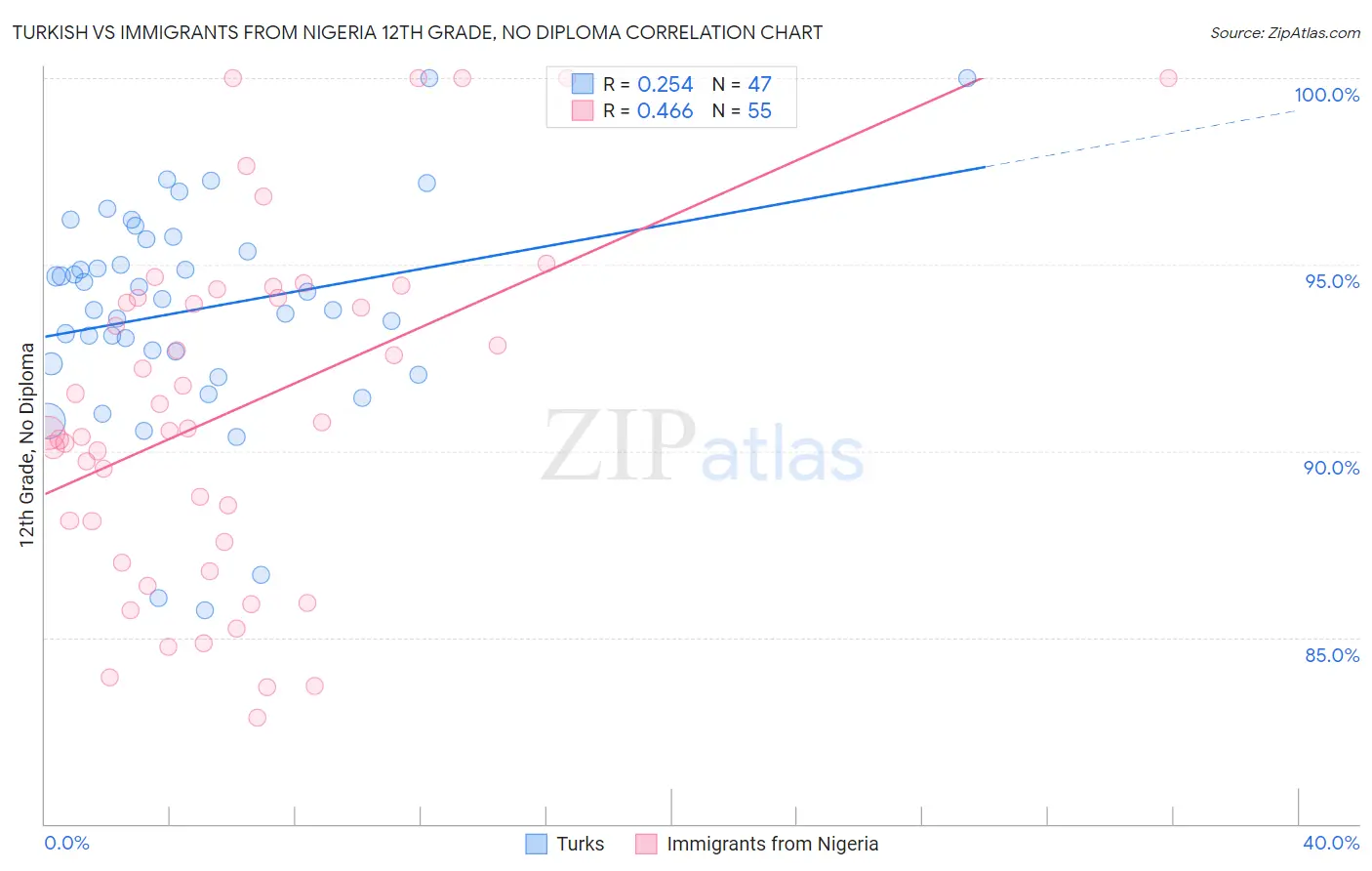 Turkish vs Immigrants from Nigeria 12th Grade, No Diploma Correlation Chart