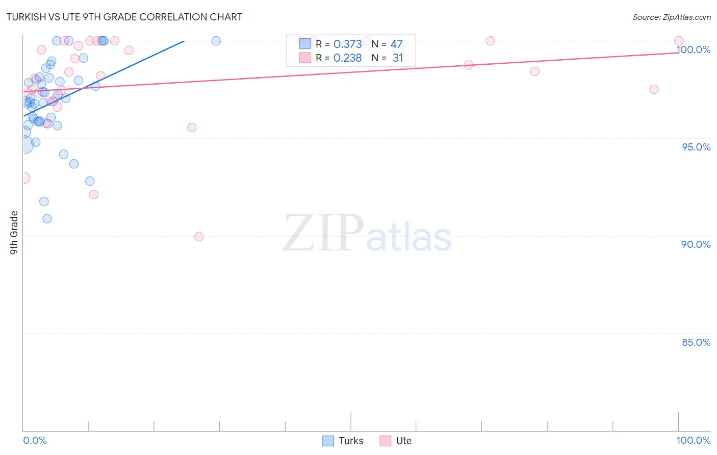 The statistical analysis conducted on geographies consisting of 271,864,133 people shows a mild positive correlation between the proportion of Turks and percentage of population with at least 9th grade education in the United States with a correlation coefficient (R) of 0.373 and weighted average of 95.8%. Similarly, the statistical analysis conducted on geographies consisting of 55,668,539 people shows a weak positive correlation between the proportion of Ute and percentage of population with at least 9th grade education in the United States with a correlation coefficient (R) of 0.238 and weighted average of 95.0%, a difference of 0.89%.