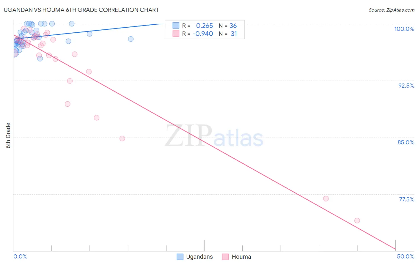 The statistical analysis conducted on geographies consisting of 93,991,892 people shows a weak positive correlation between the proportion of Ugandans and percentage of population with at least 6th grade education in the United States with a correlation coefficient (R) of 0.265 and weighted average of 97.1%. Similarly, the statistical analysis conducted on geographies consisting of 36,795,916 people shows a near-perfect negative correlation between the proportion of Houma and percentage of population with at least 6th grade education in the United States with a correlation coefficient (R) of -0.940 and weighted average of 96.2%, a difference of 0.90%.