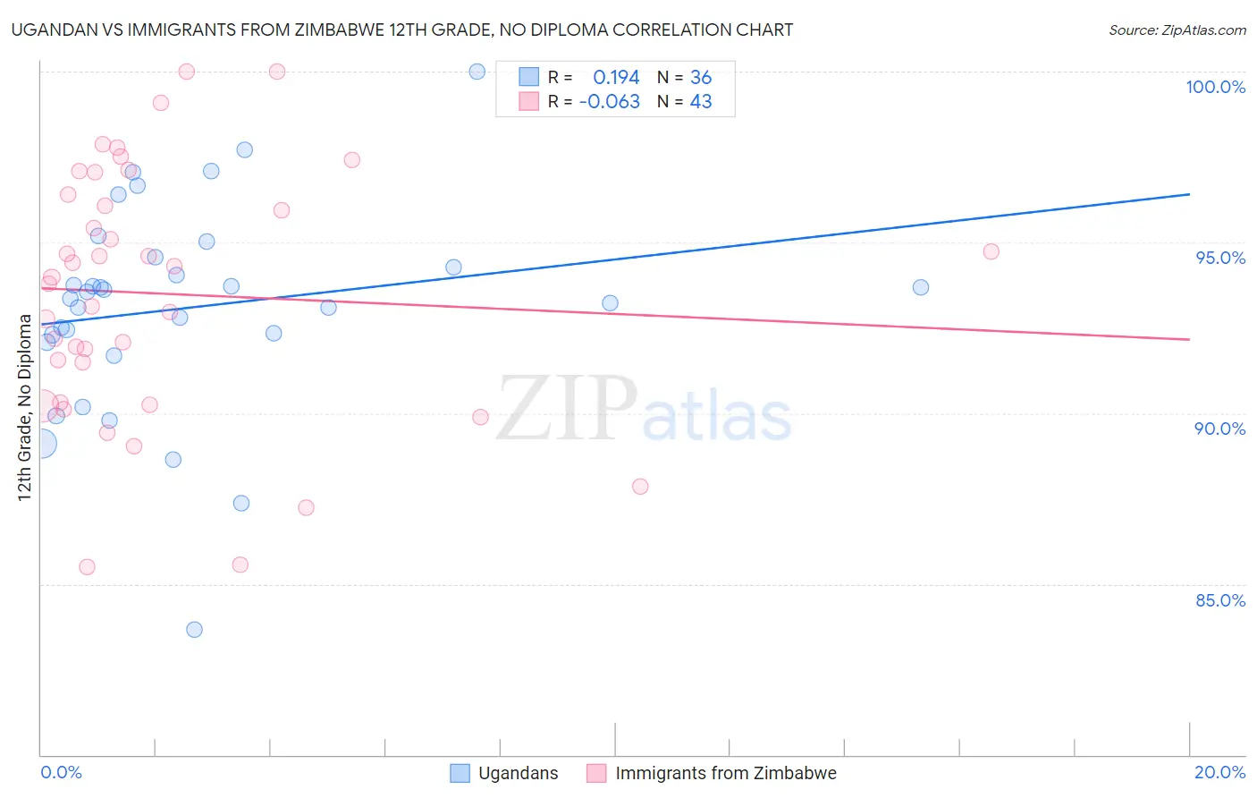 Ugandan vs Immigrants from Zimbabwe 12th Grade, No Diploma Correlation Chart