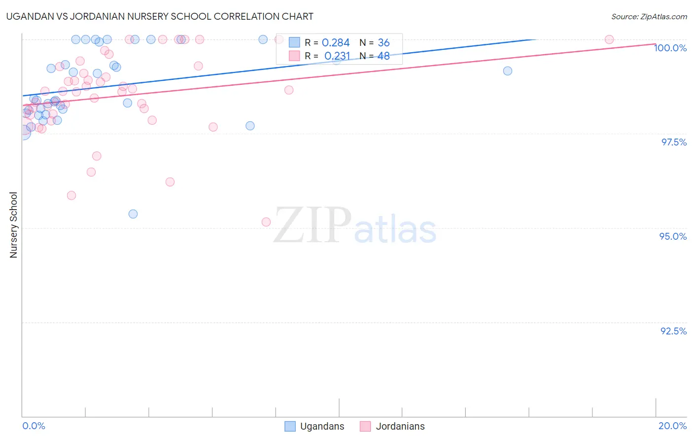 In terms of nursery school, the demographic groups most similar to Ugandans are Chilean (98.0%, a difference of 0.0%), Spanish American (98.0%, a difference of 0.0%), Immigrants from Spain (98.0%, a difference of 0.0%), Immigrants from Russia (98.0%, a difference of 0.010%), and Immigrants from Eastern Europe (98.0%, a difference of 0.010%). Similarly, the demographic groups most similar to Jordanians are Apache (98.1%, a difference of 0.0%), Soviet Union (98.0%, a difference of 0.0%), Hmong (98.1%, a difference of 0.010%), Immigrants from Greece (98.1%, a difference of 0.010%), and Dutch West Indian (98.0%, a difference of 0.010%).