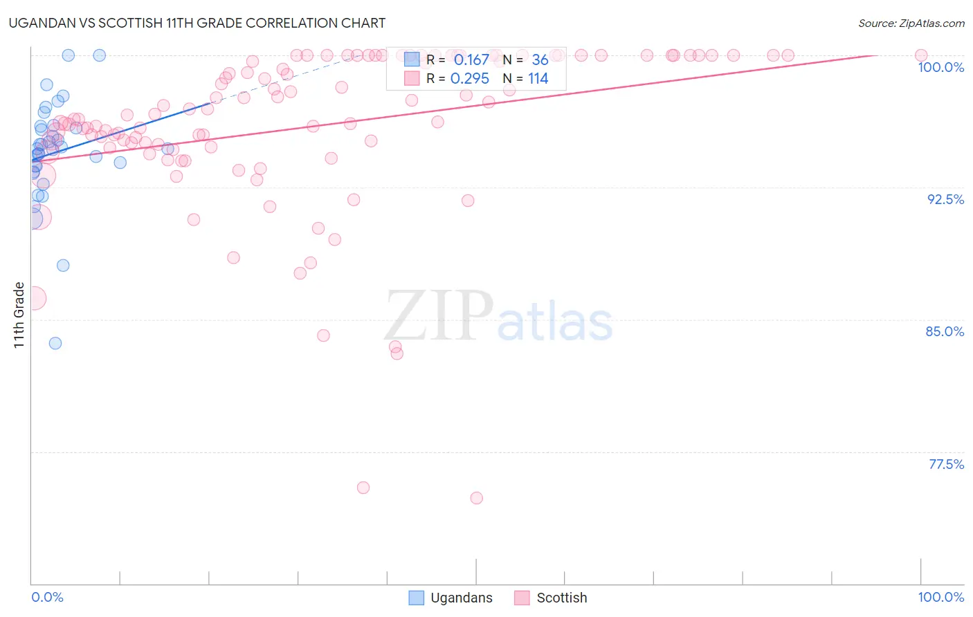 The statistical analysis conducted on geographies consisting of 93,991,892 people shows a poor positive correlation between the proportion of Ugandans and percentage of population with at least 11th grade education in the United States with a correlation coefficient (R) of 0.167 and weighted average of 92.9%. Similarly, the statistical analysis conducted on geographies consisting of 567,140,505 people shows a weak positive correlation between the proportion of Scottish and percentage of population with at least 11th grade education in the United States with a correlation coefficient (R) of 0.295 and weighted average of 94.4%, a difference of 1.6%.