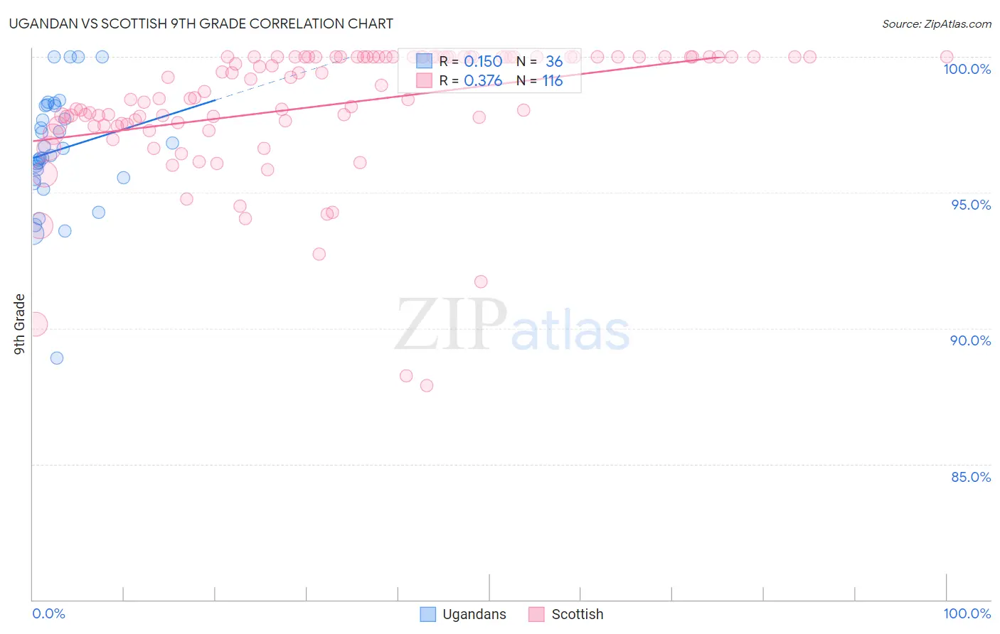 The statistical analysis conducted on geographies consisting of 93,991,892 people shows a poor positive correlation between the proportion of Ugandans and percentage of population with at least 9th grade education in the United States with a correlation coefficient (R) of 0.150 and weighted average of 95.1%. Similarly, the statistical analysis conducted on geographies consisting of 567,141,209 people shows a mild positive correlation between the proportion of Scottish and percentage of population with at least 9th grade education in the United States with a correlation coefficient (R) of 0.376 and weighted average of 96.5%, a difference of 1.5%.