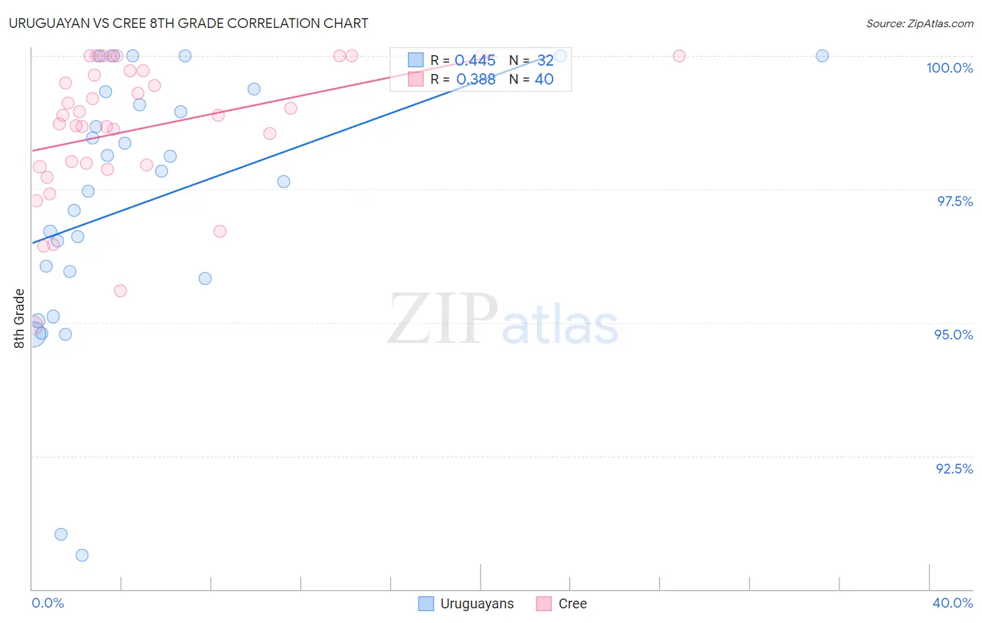 The statistical analysis conducted on geographies consisting of 144,782,794 people shows a moderate positive correlation between the proportion of Uruguayans and percentage of population with at least 8th grade education in the United States with a correlation coefficient (R) of 0.445 and weighted average of 95.1%. Similarly, the statistical analysis conducted on geographies consisting of 76,204,399 people shows a mild positive correlation between the proportion of Cree and percentage of population with at least 8th grade education in the United States with a correlation coefficient (R) of 0.388 and weighted average of 96.4%, a difference of 1.4%.