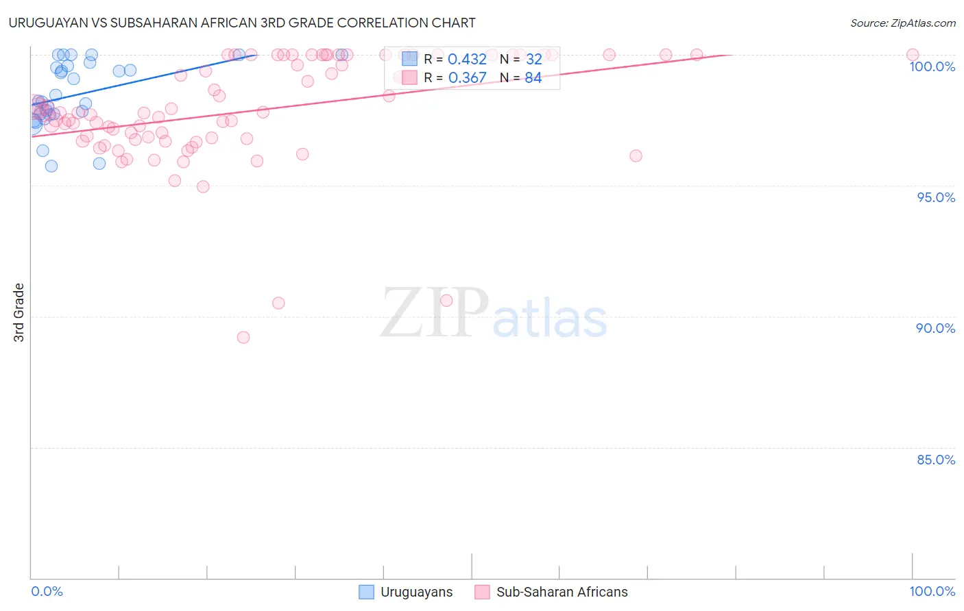 In terms of 3rd grade, the demographic groups most similar to Uruguayans are Immigrants from Panama (97.5%, a difference of 0.0%), Immigrants from Morocco (97.5%, a difference of 0.0%), South American Indian (97.5%, a difference of 0.010%), Immigrants from Nepal (97.5%, a difference of 0.010%), and Sierra Leonean (97.5%, a difference of 0.010%). Similarly, the demographic groups most similar to Sub-Saharan Africans are Immigrants from Sudan (97.5%, a difference of 0.010%), Senegalese (97.5%, a difference of 0.010%), Immigrants from Pakistan (97.5%, a difference of 0.010%), Immigrants from Costa Rica (97.5%, a difference of 0.010%), and Sudanese (97.5%, a difference of 0.020%).