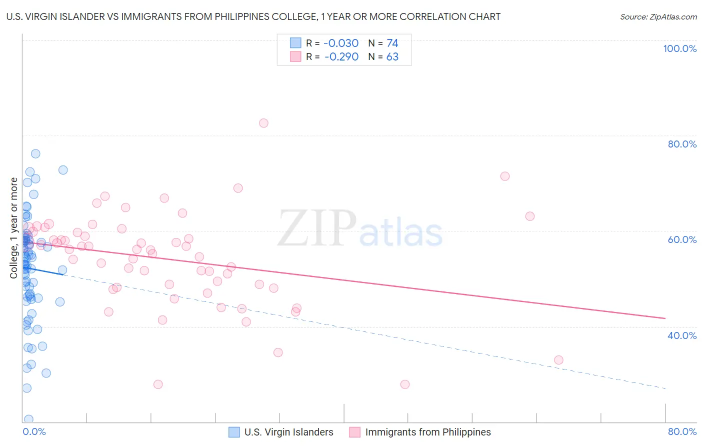U.S. Virgin Islander vs Immigrants from Philippines College, 1 year or more Correlation Chart