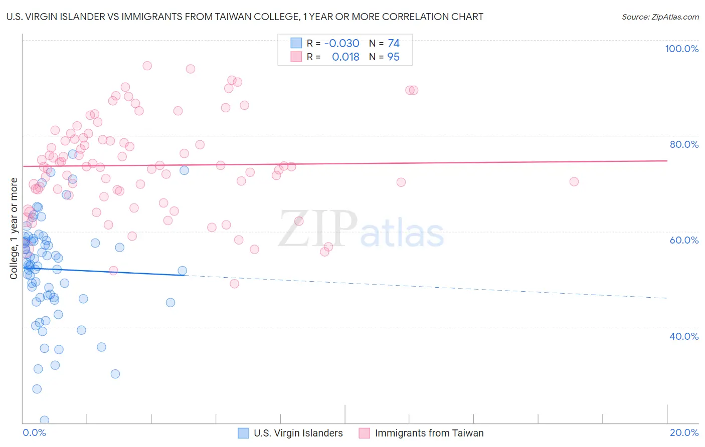 U.S. Virgin Islander vs Immigrants from Taiwan College, 1 year or more Correlation Chart