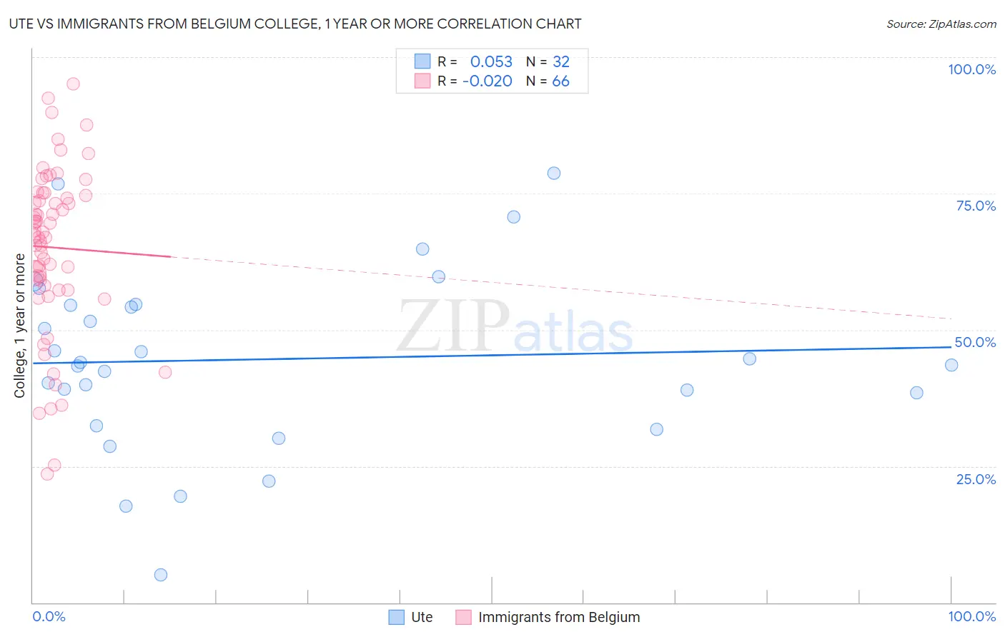 Ute vs Immigrants from Belgium College, 1 year or more Correlation Chart