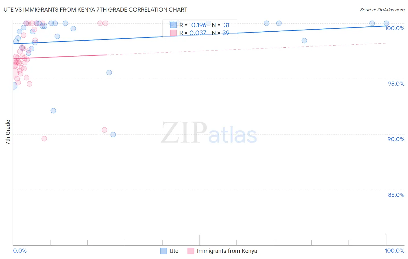 In terms of 7th grade, the demographic groups most similar to Ute are Immigrants from Ukraine (96.1%, a difference of 0.0%), Egyptian (96.1%, a difference of 0.010%), Immigrants from Poland (96.1%, a difference of 0.020%), Immigrants from Kazakhstan (96.1%, a difference of 0.030%), and Immigrants from Sri Lanka (96.1%, a difference of 0.030%). Similarly, the demographic groups most similar to Immigrants from Kenya are Alsatian (96.1%, a difference of 0.0%), Bermudan (96.1%, a difference of 0.0%), Arab (96.2%, a difference of 0.010%), Pima (96.1%, a difference of 0.020%), and Spaniard (96.1%, a difference of 0.030%).