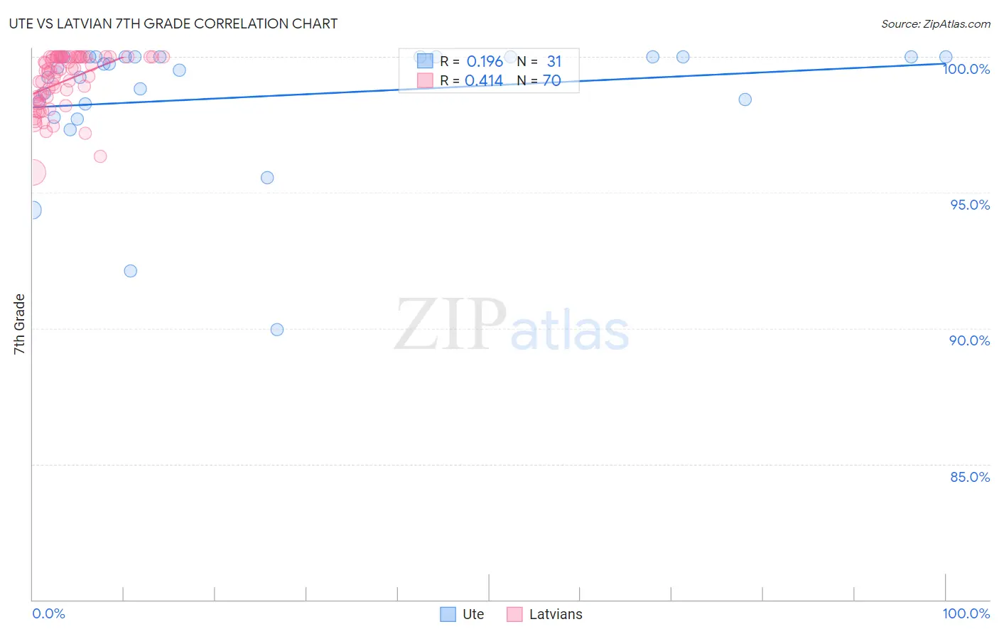 In terms of 7th grade, the demographic groups most similar to Ute are Immigrants from Ukraine (96.1%, a difference of 0.0%), Egyptian (96.1%, a difference of 0.010%), Immigrants from Poland (96.1%, a difference of 0.020%), Immigrants from Kazakhstan (96.1%, a difference of 0.030%), and Immigrants from Sri Lanka (96.1%, a difference of 0.030%).