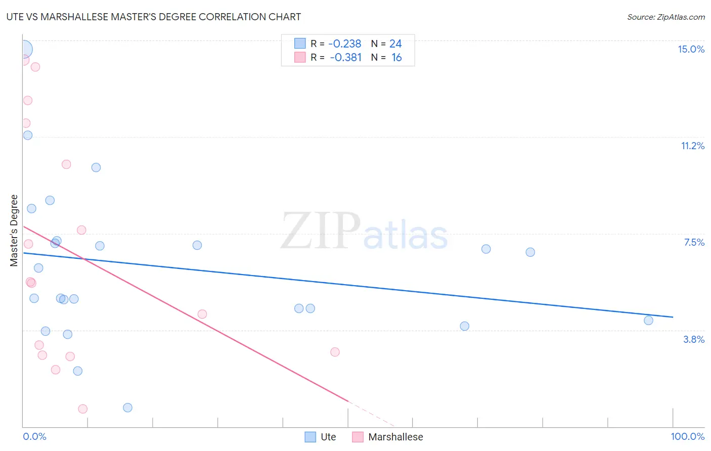 The statistical analysis conducted on geographies consisting of 55,657,479 people shows a weak negative correlation between the proportion of Ute and percentage of population with at least master's degree education in the United States with a correlation coefficient (R) of -0.238 and weighted average of 11.7%. Similarly, the statistical analysis conducted on geographies consisting of 14,761,315 people shows a mild negative correlation between the proportion of Marshallese and percentage of population with at least master's degree education in the United States with a correlation coefficient (R) of -0.381 and weighted average of 11.6%, a difference of 1.3%.
