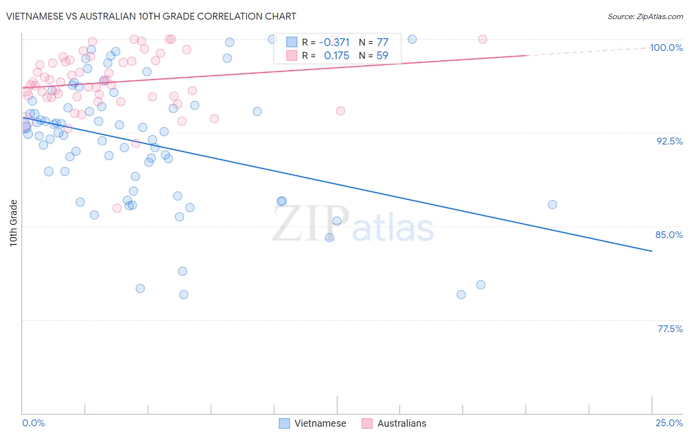The statistical analysis conducted on geographies consisting of 170,728,240 people shows a mild negative correlation between the proportion of Vietnamese and percentage of population with at least 10th grade education in the United States with a correlation coefficient (R) of -0.371 and weighted average of 90.9%. Similarly, the statistical analysis conducted on geographies consisting of 224,153,693 people shows a poor positive correlation between the proportion of Australians and percentage of population with at least 10th grade education in the United States with a correlation coefficient (R) of 0.175 and weighted average of 95.1%, a difference of 4.6%.