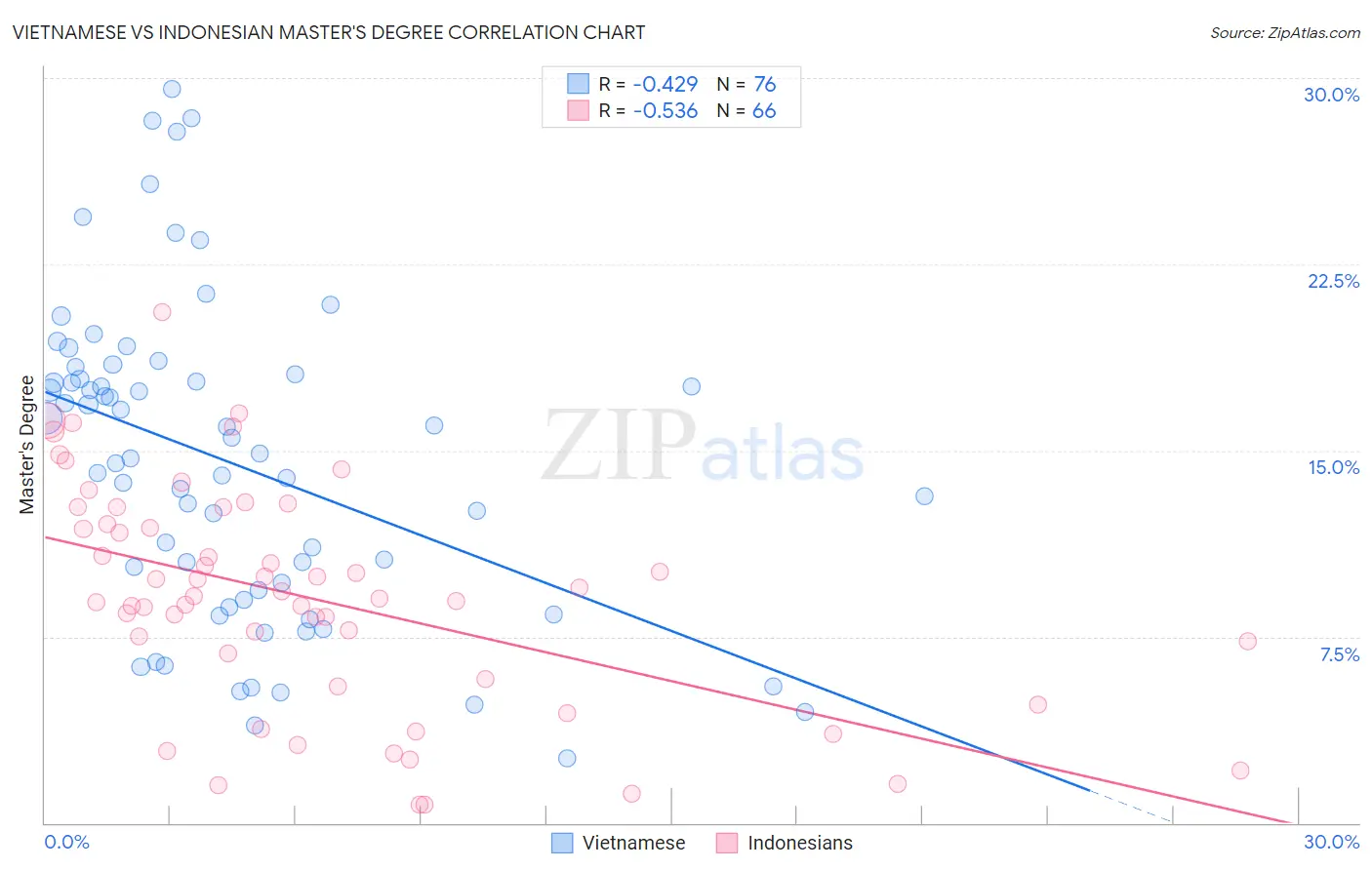 The statistical analysis conducted on geographies consisting of 170,730,532 people shows a moderate negative correlation between the proportion of Vietnamese and percentage of population with at least master's degree education in the United States with a correlation coefficient (R) of -0.429 and weighted average of 15.8%. Similarly, the statistical analysis conducted on geographies consisting of 162,683,537 people shows a substantial negative correlation between the proportion of Indonesians and percentage of population with at least master's degree education in the United States with a correlation coefficient (R) of -0.536 and weighted average of 12.6%, a difference of 24.7%.