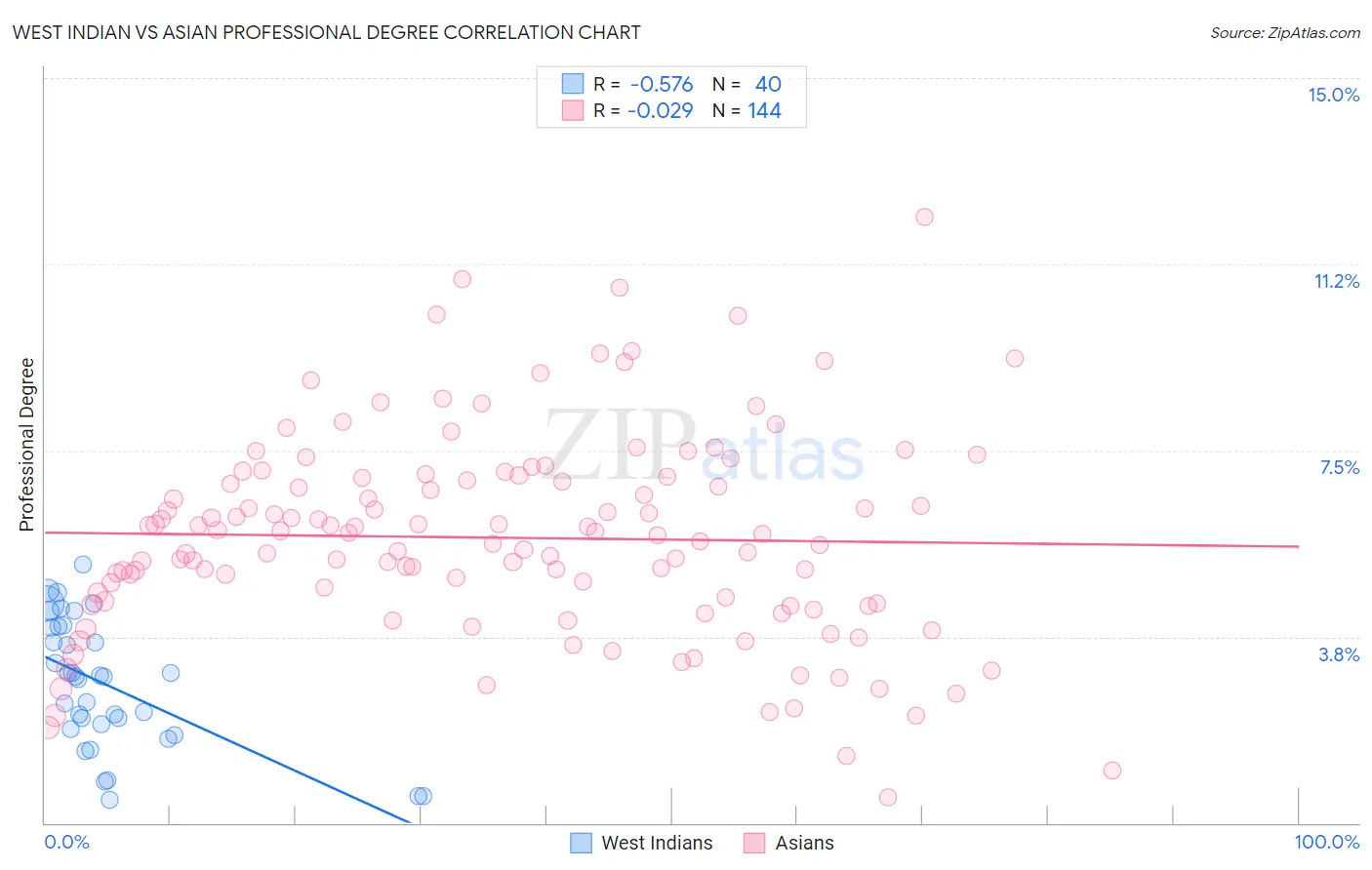 The statistical analysis conducted on geographies consisting of 253,709,742 people shows a substantial negative correlation between the proportion of West Indians and percentage of population with at least professional degree education in the United States with a correlation coefficient (R) of -0.576 and weighted average of 4.1%. Similarly, the statistical analysis conducted on geographies consisting of 546,309,051 people shows no correlation between the proportion of Asians and percentage of population with at least professional degree education in the United States with a correlation coefficient (R) of -0.029 and weighted average of 5.5%, a difference of 36.0%.