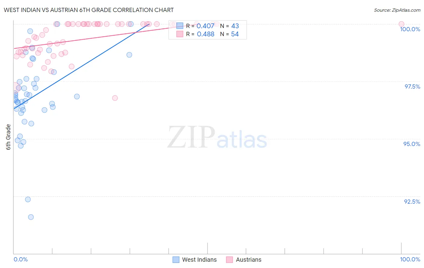 In terms of 6th grade, the demographic groups most similar to West Indians are Immigrants from Uzbekistan (96.3%, a difference of 0.0%), Immigrants from South America (96.3%, a difference of 0.0%), Immigrants from Hong Kong (96.3%, a difference of 0.010%), Ghanaian (96.4%, a difference of 0.030%), and Afghan (96.4%, a difference of 0.030%).