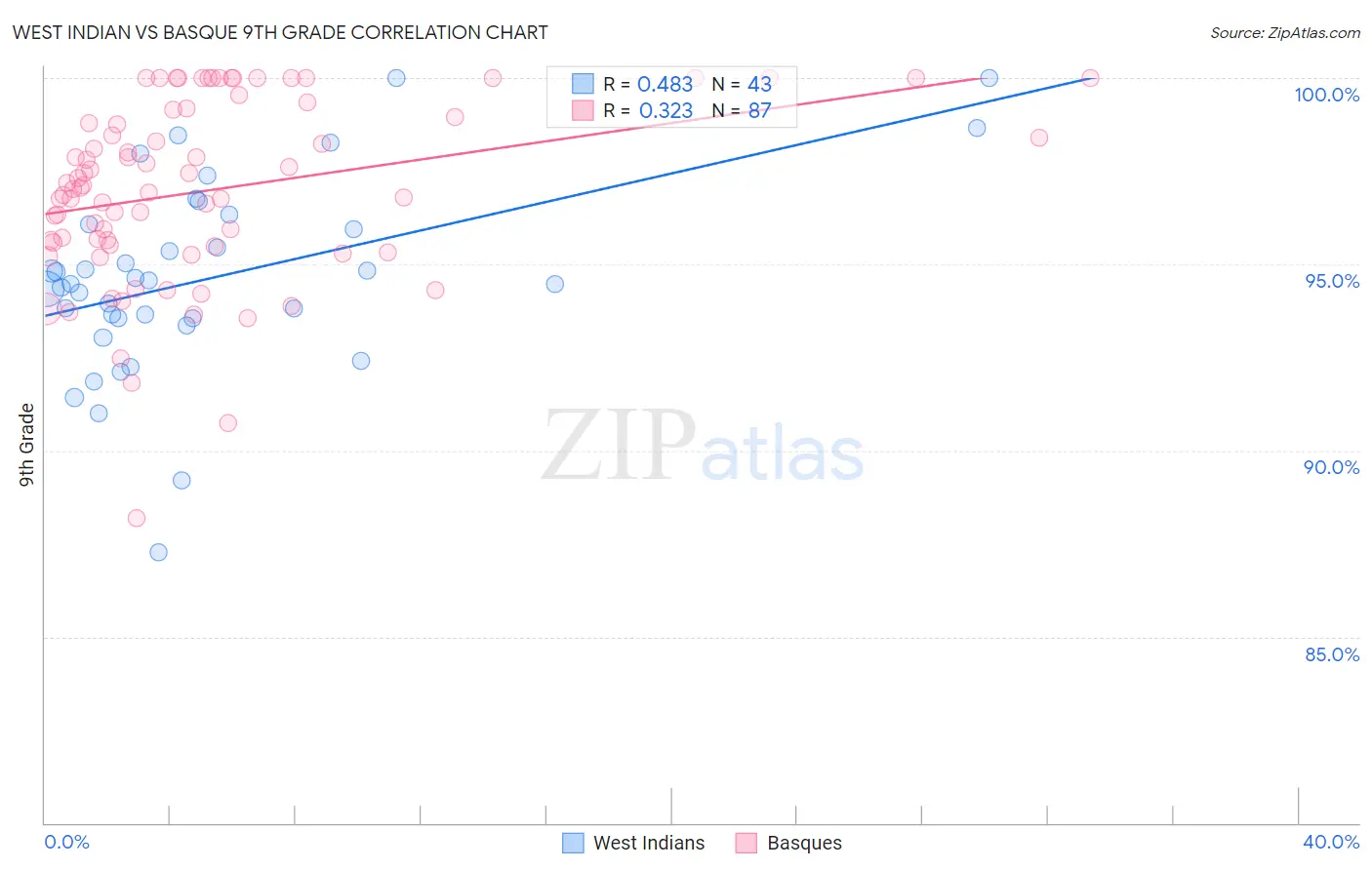 The statistical analysis conducted on geographies consisting of 254,059,006 people shows a moderate positive correlation between the proportion of West Indians and percentage of population with at least 9th grade education in the United States with a correlation coefficient (R) of 0.483 and weighted average of 93.7%. Similarly, the statistical analysis conducted on geographies consisting of 165,777,136 people shows a mild positive correlation between the proportion of Basques and percentage of population with at least 9th grade education in the United States with a correlation coefficient (R) of 0.323 and weighted average of 95.4%, a difference of 1.7%.