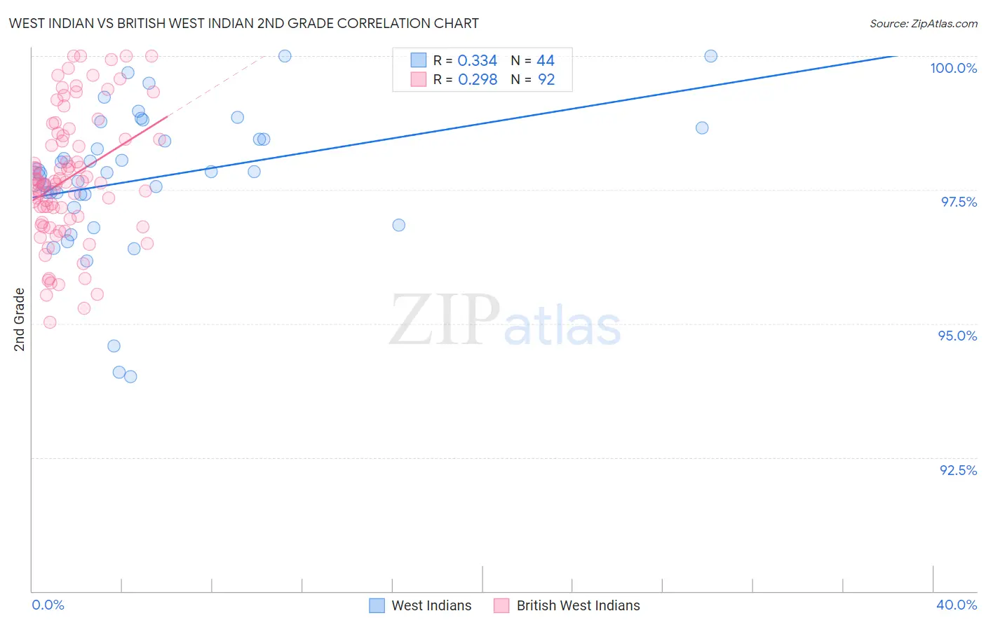 The statistical analysis conducted on geographies consisting of 254,063,654 people shows a mild positive correlation between the proportion of West Indians and percentage of population with at least 2nd grade education in the United States with a correlation coefficient (R) of 0.334 and weighted average of 97.4%. Similarly, the statistical analysis conducted on geographies consisting of 152,691,173 people shows a weak positive correlation between the proportion of British West Indians and percentage of population with at least 2nd grade education in the United States with a correlation coefficient (R) of 0.298 and weighted average of 97.2%, a difference of 0.26%.