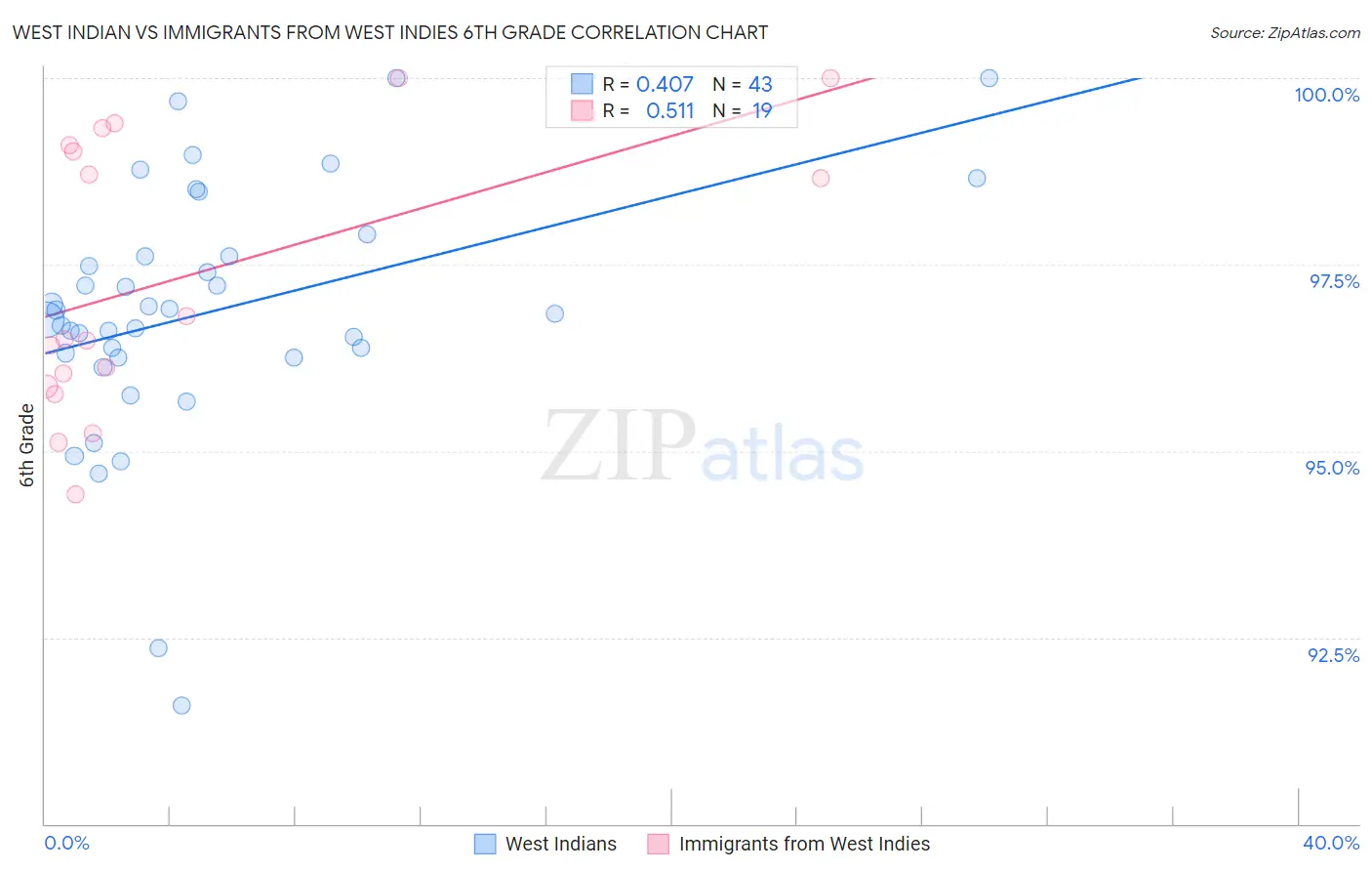 In terms of 6th grade, the demographic groups most similar to West Indians are Immigrants from Uzbekistan (96.3%, a difference of 0.0%), Immigrants from South America (96.3%, a difference of 0.0%), Immigrants from Hong Kong (96.3%, a difference of 0.010%), Ghanaian (96.4%, a difference of 0.030%), and Afghan (96.4%, a difference of 0.030%).