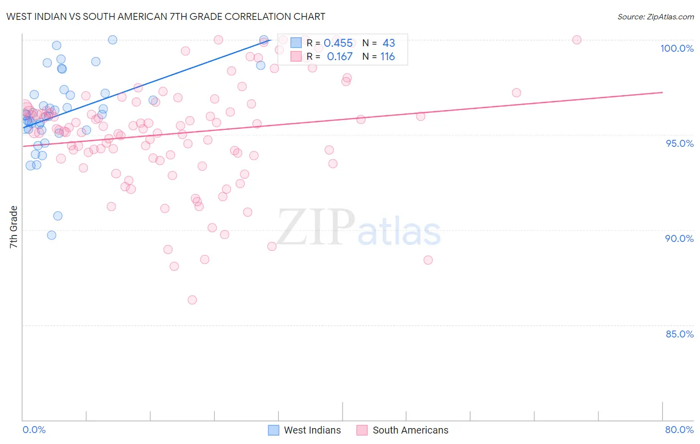 In terms of 7th grade, the demographic groups most similar to West Indians are Immigrants from Somalia (95.2%, a difference of 0.0%), Afghan (95.3%, a difference of 0.010%), Immigrants from Nigeria (95.2%, a difference of 0.010%), Immigrants from Costa Rica (95.3%, a difference of 0.040%), and Immigrants from Uruguay (95.2%, a difference of 0.050%). Similarly, the demographic groups most similar to South Americans are Immigrants from Somalia (95.2%, a difference of 0.0%), Afghan (95.3%, a difference of 0.010%), Immigrants from Nigeria (95.2%, a difference of 0.010%), Immigrants from Costa Rica (95.3%, a difference of 0.040%), and Immigrants from Uruguay (95.2%, a difference of 0.050%).