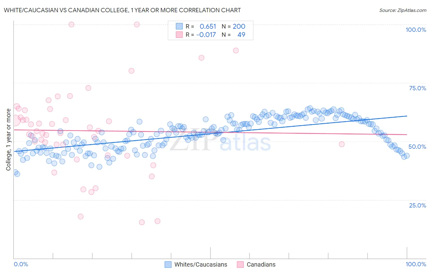 White/Caucasian vs Canadian College, 1 year or more Correlation Chart