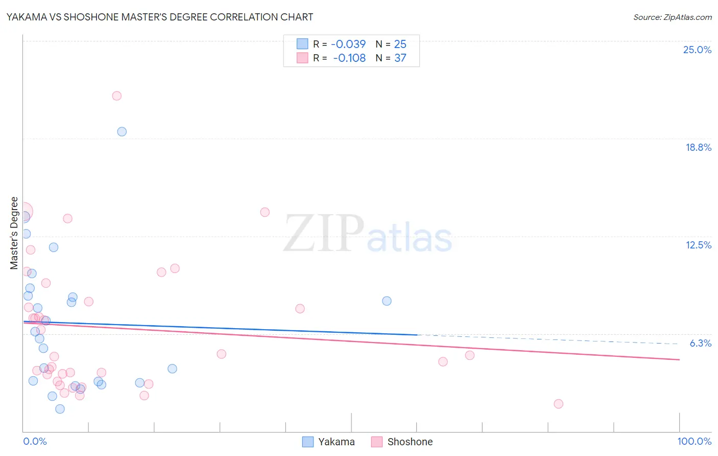 The statistical analysis conducted on geographies consisting of 19,918,334 people shows no correlation between the proportion of Yakama and percentage of population with at least master's degree education in the United States with a correlation coefficient (R) of -0.039 and weighted average of 9.5%. Similarly, the statistical analysis conducted on geographies consisting of 66,620,223 people shows a poor negative correlation between the proportion of Shoshone and percentage of population with at least master's degree education in the United States with a correlation coefficient (R) of -0.108 and weighted average of 11.1%, a difference of 17.3%.