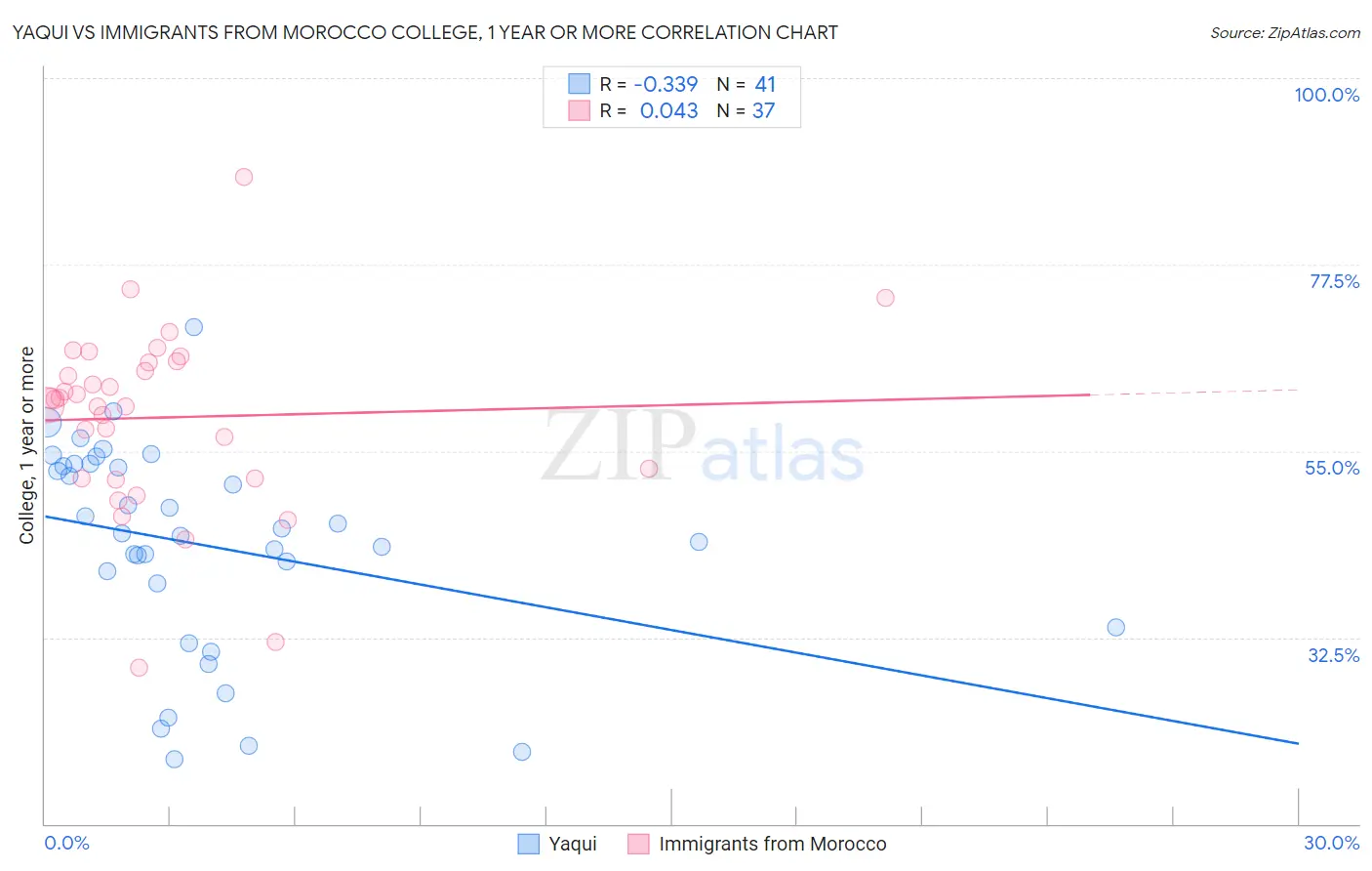 Yaqui vs Immigrants from Morocco College, 1 year or more Correlation Chart