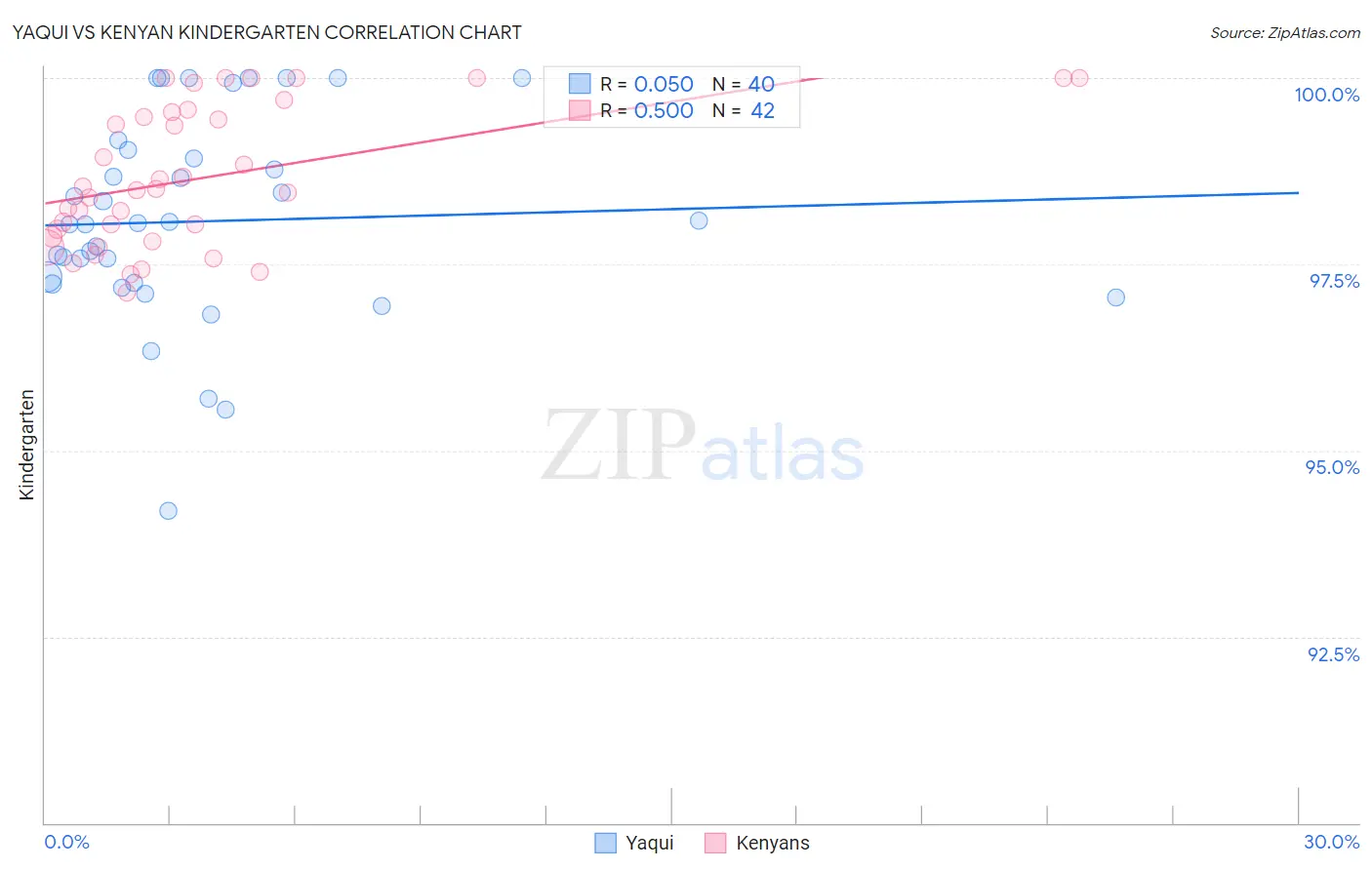 In terms of kindergarten, the demographic groups most similar to Yaqui are Immigrants from Asia (97.6%, a difference of 0.0%), Immigrants from Congo (97.6%, a difference of 0.0%), Immigrants from Iraq (97.6%, a difference of 0.010%), Immigrants from Africa (97.6%, a difference of 0.010%), and Immigrants from Colombia (97.6%, a difference of 0.010%).