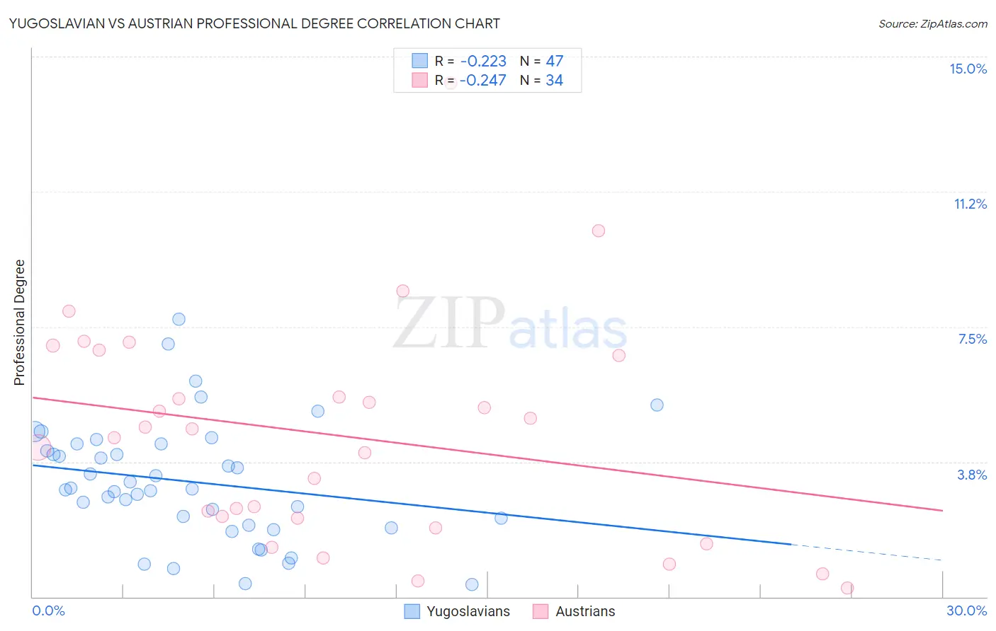 The statistical analysis conducted on geographies consisting of 285,276,070 people shows a weak negative correlation between the proportion of Yugoslavians and percentage of population with at least professional degree education in the United States with a correlation coefficient (R) of -0.223 and weighted average of 4.1%. Similarly, the statistical analysis conducted on geographies consisting of 450,559,334 people shows a weak negative correlation between the proportion of Austrians and percentage of population with at least professional degree education in the United States with a correlation coefficient (R) of -0.247 and weighted average of 5.2%, a difference of 25.6%.