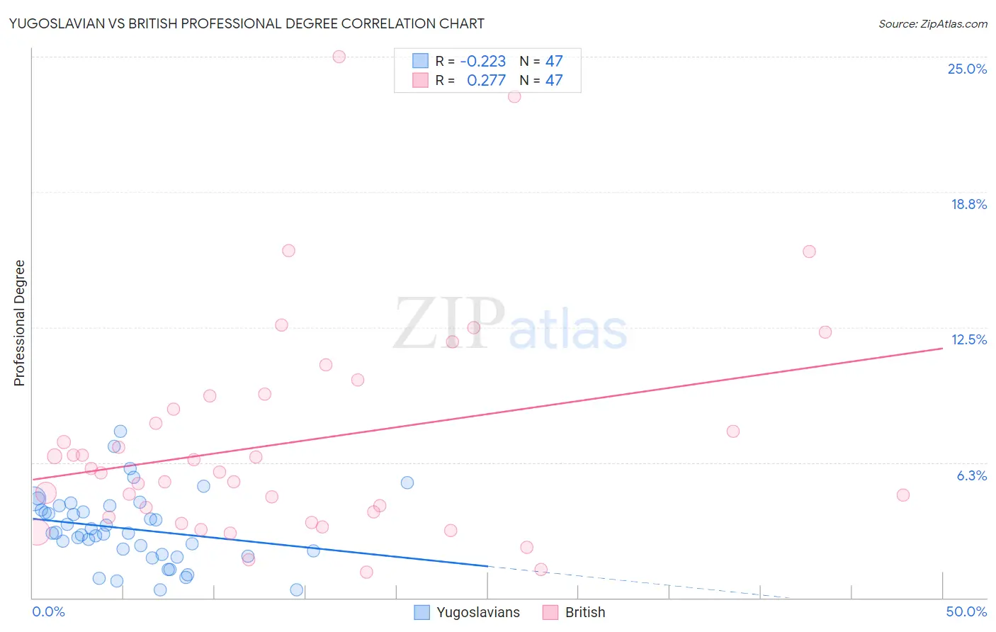 The statistical analysis conducted on geographies consisting of 285,276,070 people shows a weak negative correlation between the proportion of Yugoslavians and percentage of population with at least professional degree education in the United States with a correlation coefficient (R) of -0.223 and weighted average of 4.1%. Similarly, the statistical analysis conducted on geographies consisting of 527,483,146 people shows a weak positive correlation between the proportion of British and percentage of population with at least professional degree education in the United States with a correlation coefficient (R) of 0.277 and weighted average of 5.0%, a difference of 22.5%.