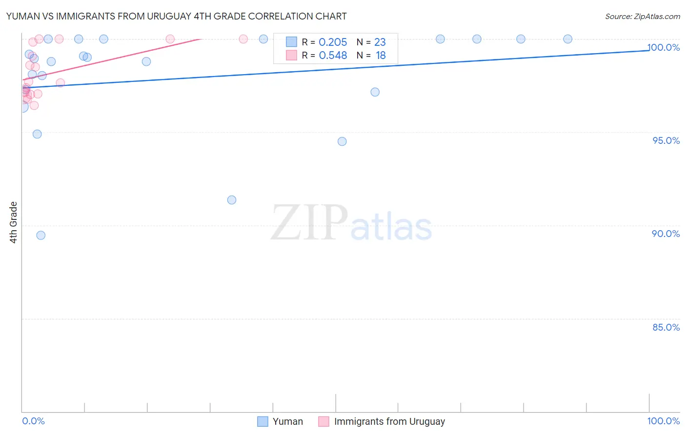 In terms of 4th grade, the demographic groups most similar to Yuman are Assyrian/Chaldean/Syriac (97.2%, a difference of 0.0%), Immigrants from Western Asia (97.2%, a difference of 0.010%), Senegalese (97.2%, a difference of 0.010%), Immigrants from Eastern Asia (97.2%, a difference of 0.010%), and Uruguayan (97.2%, a difference of 0.020%). Similarly, the demographic groups most similar to Immigrants from Uruguay are Korean (97.1%, a difference of 0.0%), Immigrants from Eastern Africa (97.1%, a difference of 0.0%), Ethiopian (97.1%, a difference of 0.0%), Immigrants from Asia (97.1%, a difference of 0.0%), and Asian (97.1%, a difference of 0.010%).