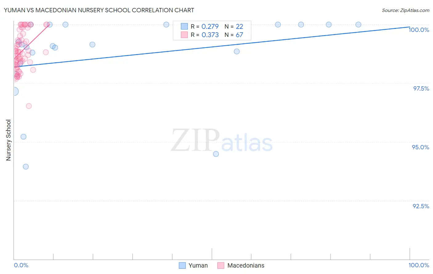 In terms of nursery school, the demographic groups most similar to Yuman are Guamanian/Chamorro (97.9%, a difference of 0.0%), Black/African American (97.9%, a difference of 0.010%), Paraguayan (97.9%, a difference of 0.010%), Mongolian (97.9%, a difference of 0.010%), and Hawaiian (97.9%, a difference of 0.010%).