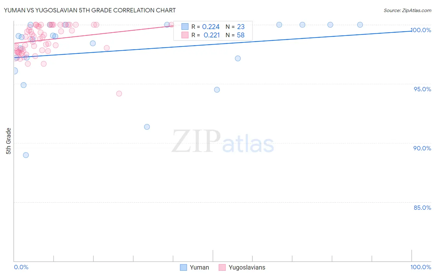 In terms of 5th grade, the demographic groups most similar to Yuman are Assyrian/Chaldean/Syriac (97.0%, a difference of 0.0%), Immigrants from Western Asia (97.0%, a difference of 0.0%), Immigrants from Pakistan (97.0%, a difference of 0.010%), Immigrants from Malaysia (97.0%, a difference of 0.010%), and Immigrants from Eastern Asia (97.0%, a difference of 0.010%).