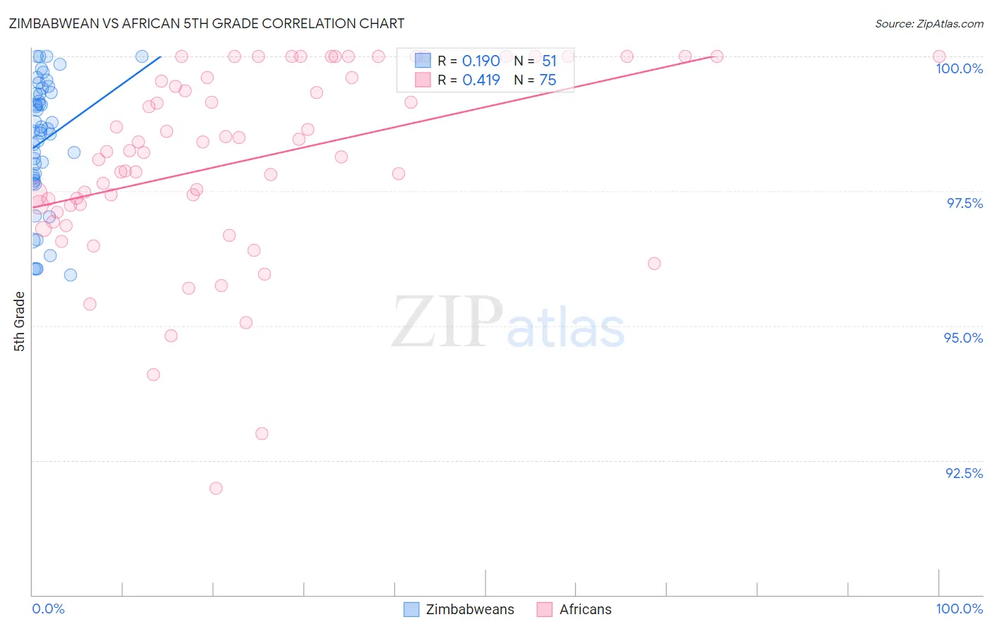 In terms of 5th grade, the demographic groups most similar to Zimbabweans are Potawatomi (97.8%, a difference of 0.0%), Immigrants from Belgium (97.8%, a difference of 0.0%), Cypriot (97.8%, a difference of 0.010%), Immigrants from Lithuania (97.8%, a difference of 0.020%), and Immigrants from India (97.8%, a difference of 0.020%).